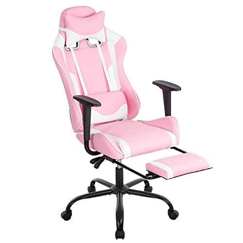- COMFORT FROM EVERY ANGLE – Our brand-new ergonomic racing chair is thickly cushioned for maximum comfort, whether you’re spending long hours at the office, in front of the computer, or gaming. Covered with breathable premium PU leather, the chair is equipped with freely adjustable lumbar support and a headrest pillow to protect your spine and neck, while the adjustable reclining feature allows users to lock in any reclining position, from 90-155°