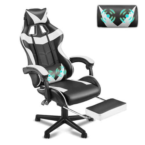 - [Ergonomic Design Gamer Chair]-Scientific streamline, accurate to millimeter ergonomic design, partition support cervical spine, waist, back, buttocks, comfortable fixed point support.Adjustable headrest to release cervical pressure; Removable lumbar pillow, from back to waist massage, care for every side.Retractable footrests allow legs to relax.